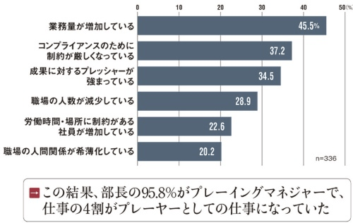 調査に回答した部長に「3年前と比較した職場の状況」を尋ねた項目では、「業務量が増加している」(45・5%)、「コンプライアンスのために制約が厳しくなっている」(37・2%)、「成果に対するプレッシャーが強まっている」(34・5%)などと、部長を取り巻く環境が「きつく」なっている現状が浮き彫りになった(下グラフ)。
