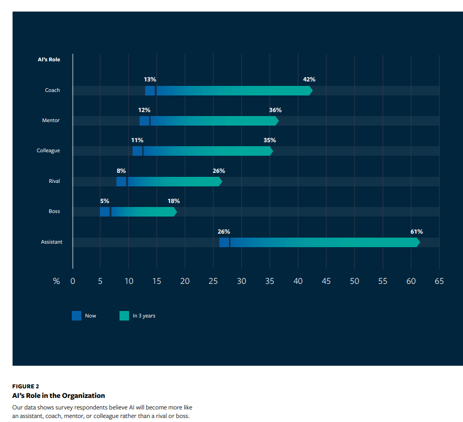 AIシステムはすでに、アシスタント、同僚、メンター、コーチ、さらにはライバルや上司としても機能しています。私たちの調査回答者の大半は、AIが3年以内にこれらの役割のそれぞれにもっと関与するようになると予想しています(図2、6ページを参照)。