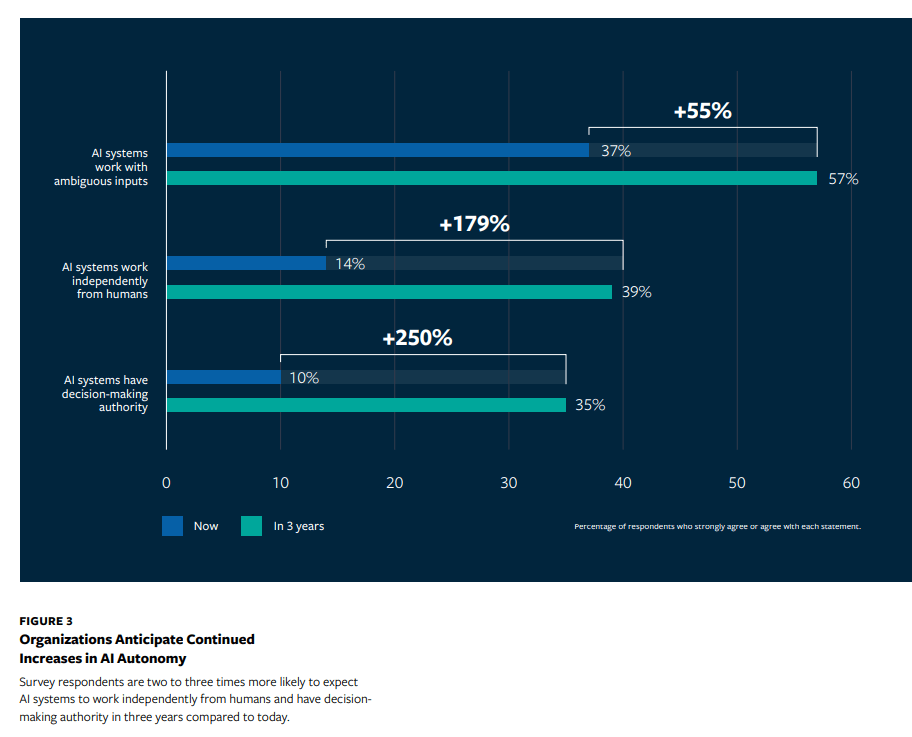 私たちのデータによると、主要なエージェントAI組織の58%が3年以内にガバナンス構造の変更を予想しており、AIシステムが意思決定権を持つという予想は250%増加しています。(図3、9ページおよび付録図1、18ページを参照。)これらの組織は、監督 vs. 自律性のジレンマを解決しているわけではありません。彼らは、誰が、あるいは何が、意思決定の責任を負うかについての永続的な曖昧さに対処できるガバナンス構造を作成しています。