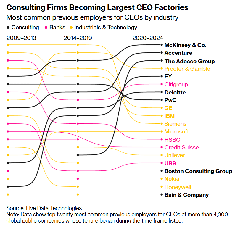 4,300社以上のグローバル上場企業のCEOのキャリアパスを独自に分析した結果によると、アクセンチュア、デロイト、PwC、EY、さらにはあまり知られていないスイスの人材サービス会社アデコ・グループの出身者が、過去15年間で世界のCEO職に占める割合を拡大させている。一方で、ライブ・データ・テクノロジーズの分析によれば、GEやIBMといった名高いCEO工場の影響力は減退している。
