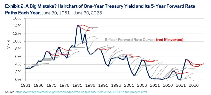 図表2は、米国の1年物国債利回りと、各年の半ばにおけるそのフォワード(「予想」)経路のヘアチャートの履歴を示している。金利低下の数十年間でさえ、上昇する毛(上昇する予測)の優勢は明らかである。しかし、私が毛が逆イールドになっている稀な例外を赤でマークすると、そのような逆イールドは、1年物金利が最近の過去と比較して異常に高い場合にのみ発生していることが明らかになる。そして、これらの逆イールドは通常、その後の1年物金利の低下を伴った。結局のところ、それほど悪い予測因子ではなかったのではないだろうか?