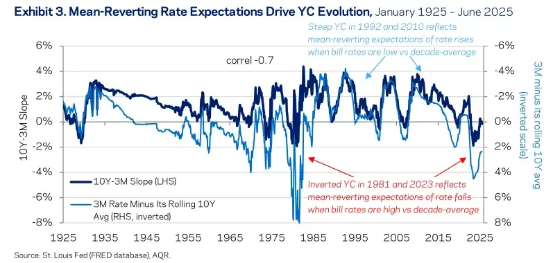 私は、YCの傾きと符号の時間変動が、平均回帰的な金利予想によって大部分が説明される証拠を示す。すなわち、低短期金利の中でのスティープなYC(例:2010年代)と、高短期金利の中でのインバートなYC(例:2023年)である。これらの予想は、予測可能な景気循環に対抗する金融政策を捉えるという点ではしばしば正しかったが、金利の世俗的な(長期的な)下落を見逃した。