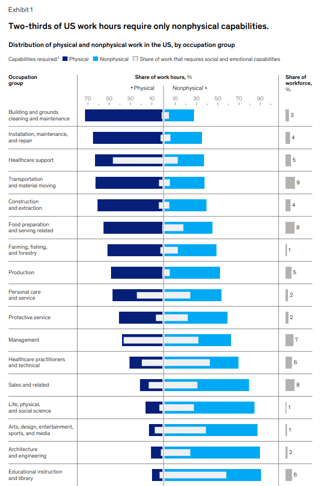 現在実証されているテクノロジーを使えば、論理的には現在のアメリカの労働時間の約57%を占める活動を自動化できることがわかりました。この推計は「人々が行う業務が変化する技術的な可能性」を反映したものであり、失職の予測ではありません。テクノロジーがより複雑な一連のタスクを担うようになっても、それらを効果的に機能させ、機械にできないことを行うために、人間は引き続き極めて重要な存在であり続けます。私たちの評価は今日の能力を反映したものであり、技術は進化し続け、その導入には数十年を要する可能性があります。