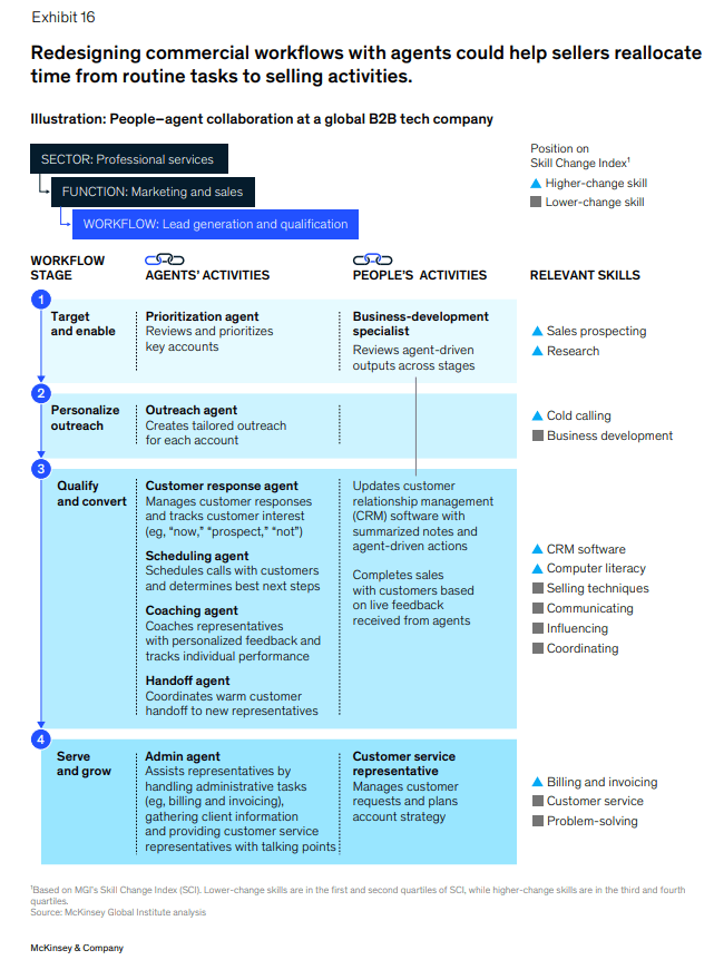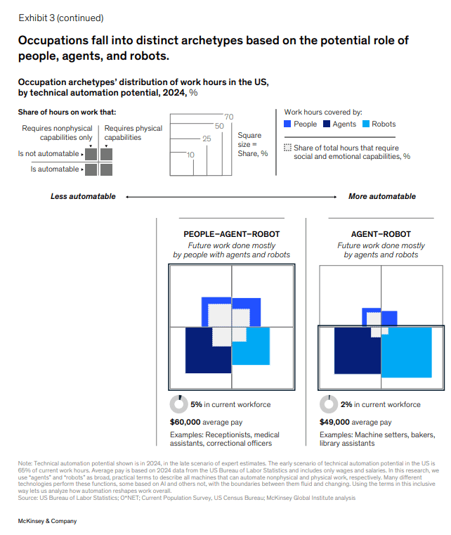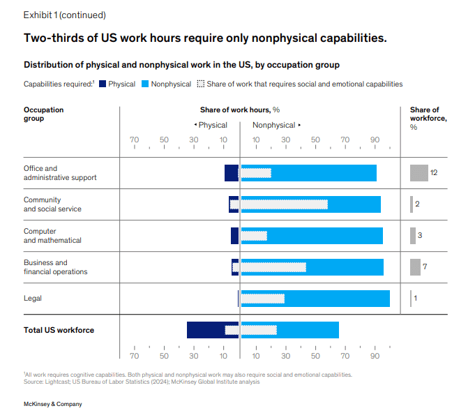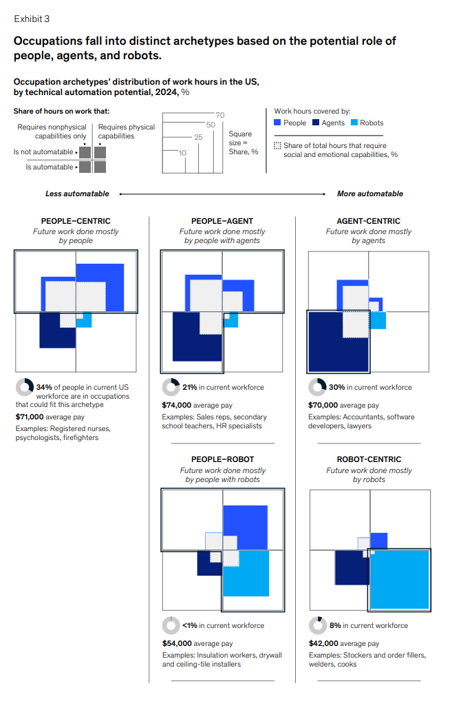 未来の仕事は、すべてAIを動力源とした「人間、エージェント、そしてロボット」のパートナーシップによって構成されるようになります。今日のテクノロジーは、理論上、現在のアメリカにおける労働時間の半分以上を自動化できる可能性を秘めています。これは仕事がどれほど劇的に変化するかを反映していますが、決して職が失われるという予測ではありません。