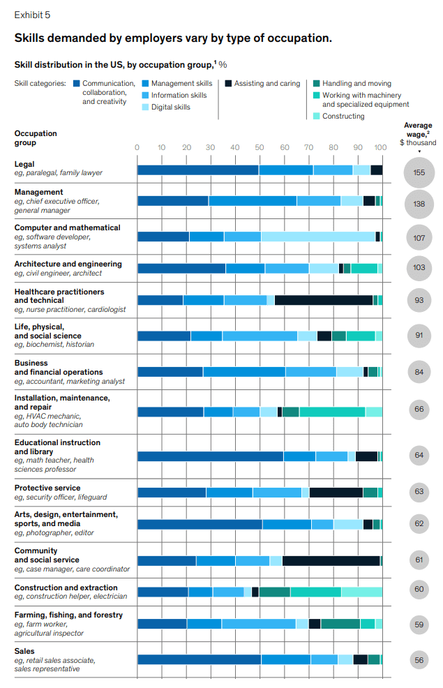 • スキルの存続: AIが普及しても人間のスキルは不要になりません。現在のスキルの約72%は、自動化可能な作業と不可能な作業の両方で使用されており、その適用方法が変わるだけです。