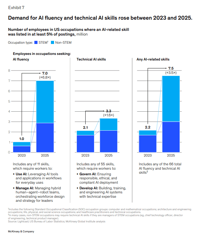 「AIフルーエンシー(AIツールを使いこなし、管理する能力)」への需要は、2025年半ばまでの2年間で約7倍に急増しました。現在では、約700万人の労働者を擁する職種において、これが採用要件となっています。AIシステムの構築や配備を担う「テクニカルAIスキル」への需要も増加していますが、その成長スピードはAIフルーエンシーに比べると緩やかです(図表7参照)。