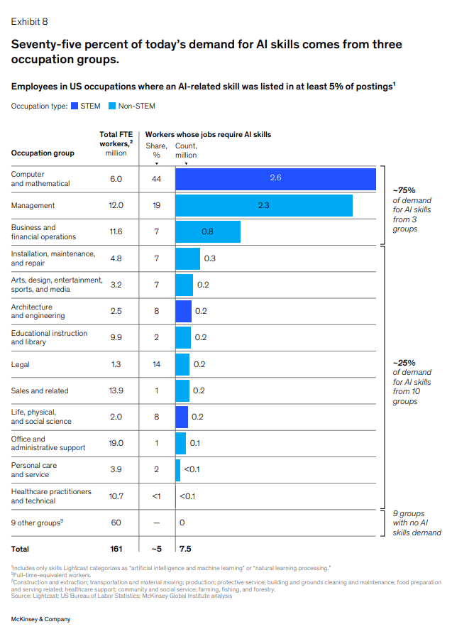 しかし、現在のところAIスキルの需要の大部分は一部の分野に集中しています。米国におけるAIスキル需要の4分の3は、「コンピュータ・数学」「マネジメント」「ビジネス・金融」の3つの職種グループに集中しています(図表8参照)。残りの需要は、テクノロジーが台頭し始めている「建築・エンジニアリング」「設置・メンテナンス・修理」「教育」など10のグループから生まれています。一方で、「建設」「輸送」「フードサービス」など、労働力の約40%を占め、中央値以下の所得層に属する他の9つの職種グループでは、AI関連スキルの需要は依然として限定的です。