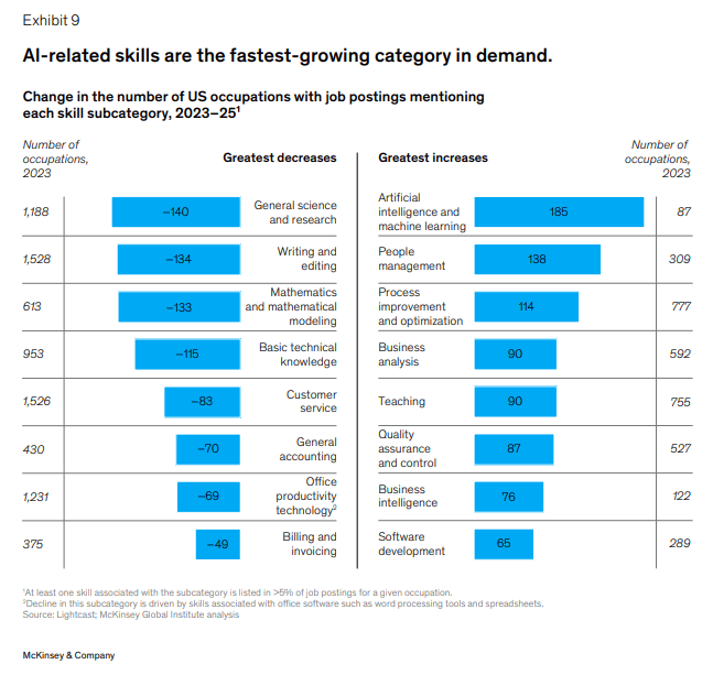 雇用主はすでに適応を始めています。「AIフルーエンシー(AIツールを使いこなし、管理する能力)」への需要は、ここ2年間で約7倍に跳ね上がりました。AIシステムの開発や統治(ガバナンス)に用いられるテクニカルなAIスキルの必要性も高まっていますが、そのペースは緩やかです。米国では約800万人が、求人票で少なくとも1つのAI関連スキルを求めている職種に就いていますが、これは今後数年間で必要とされる規模のほんの一部に過ぎません。また、品質保証、プロセス最適化、教育といった補完的なスキルや、看護や電気工事などの一部の物理的スキルへの需要も高まっています。対照的に、定型的な執筆や調査への言及は減少しています。これらはAIがすでに得意とする分野ですが、それでも多くの労働者にとっては依然として不可欠なスキルです。