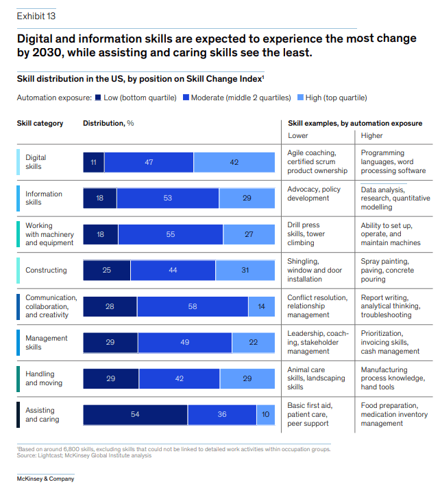 • 新たな「スキル変化指数(Skill Change Index)」は、今後5年間でどのスキルが最も自動化の影響を受けやすく、どのスキルが受けにくいかを示しています。デジタルスキルや情報処理スキルは最も大きな影響を受ける可能性がある一方、介助やケアに関連するスキルは、変化が最も少ないと考えられます。