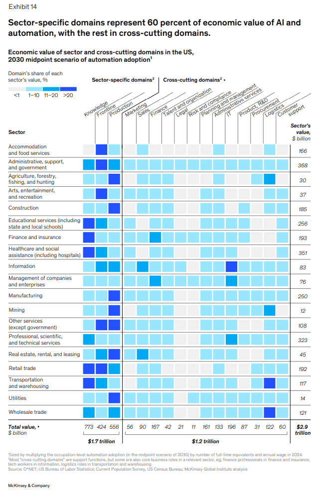 ここで示す経済的価値は、当社の「導入中間シナリオ」において、2030年までに米国で自動化される可能性がある労働時間の価値を表しており、全セクター・全機能の合計で約2.9兆ドルにのぼります(図表参照)。