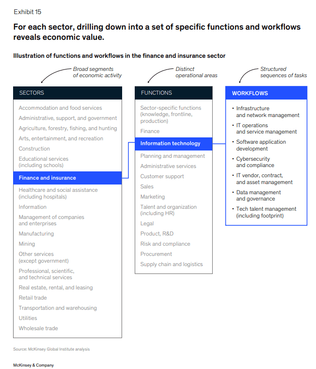 例えば「金融・保険」セクターでは、IT機能の中に7つの主要なワークフローが存在します(図表15)。すべての「セクター×機能」の組み合わせには独自のワークフローのセットがあり、それらが人間とAIの協働による利益を実現するための重要な単位となります。(他の例については、サイドバー「米国経済におけるワークフローの初期展望」を参照してください。)
