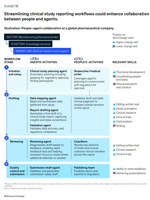 これらの変化がどのように展開しているかを示す4つの事例を紹介します。あるテクノロジー企業は、AIエージェントを使用して販売見込み客(リード)の優先順位付けとアウトリーチを管理し、スペシャリストが交渉や関係構築により多くの時間を割けるようにしました。製薬会社は、臨床報告書の草案作成にAIを適用し、エラーを削減して規制当局への提出を加速させています。カスタマーサービスでは、現在エージェントがほとんどの定型的な問い合わせを解決しており、ある地方銀行はソフトウェアの近代化を加速させるためにエージェントを活用しています。