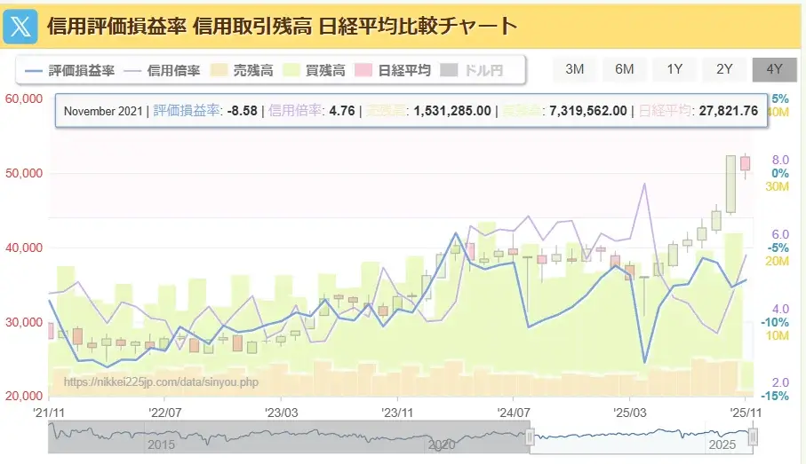 信用評価損益率と日経平均株価を比較できるチャートを掲載。過去一年分の時系列データ推移と過去2年分の信用評価損益率・信用取引残高と日経平均がチャートで比較参照できます。