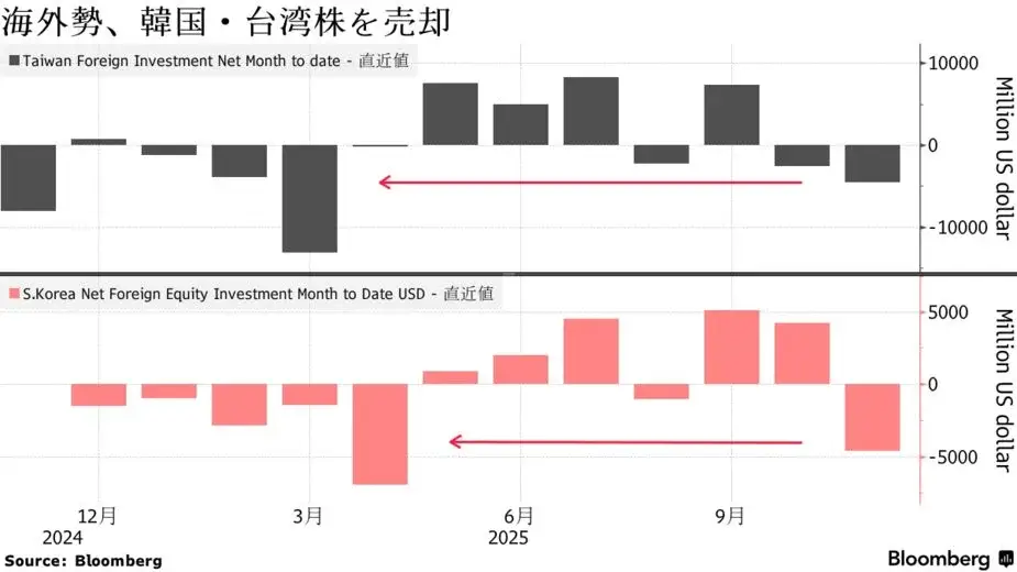 世界の投資家が、アジアの主要な人工知能(AI)市場から急ピッチで資金を引き揚げている。高いバリュエーションやリスク選好の低下が背景にある。