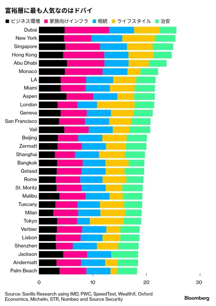 不動産サービスのサヴィルズが世界30都市を対象に、富裕層が生活する上で魅力を感じる街を調査し、ランキング形式で発表。アラブ首長国連邦(UAE)のドバイが首位になった。
