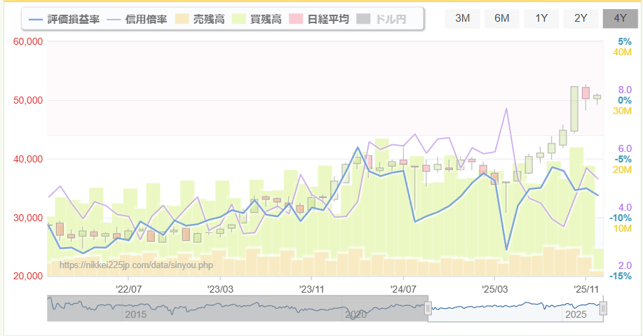 信用評価損益率と日経平均株価を比較できるチャートを掲載。過去一年分の時系列データ推移と過去2年分の信用評価損益率・信用取引残高と日経平均がチャートで比較参照できます。