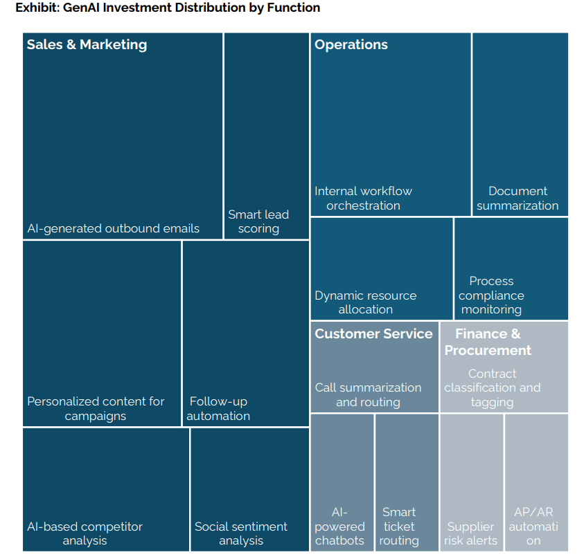 機能的な焦点という点では、生成AIツールへの投資は著しく集中している。生成AIへの支出はまだ組織全体で正式に数値化されていないため、我々は経営幹部に対し、仮の100ドルを異なる機能にどのように割り当てるかを尋ねた。我々の調査では、組織全体のAI予算配分の約70パーセントを営業およびマーケティング機能が占めた。